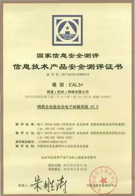 去年底,中国信息安全测评中心正式授予网易企业邮箱邮件系统EAL3+级信息安全等级认证,这是目前国内最高级别的邮件系统安全认证,网易成为国内首个、也是唯一一个获此认证的邮件服务商。