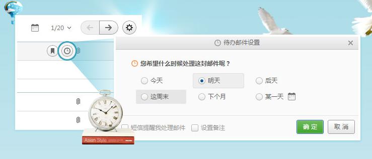 当用户第一时间看见一封邮件,如果当时正忙来不及处理和回复,可以把这封邮件标记为待办邮件。到了设置处理的时间后,邮件会在文件夹中置顶提醒,用户还可以在设置时选择通过短信提醒。