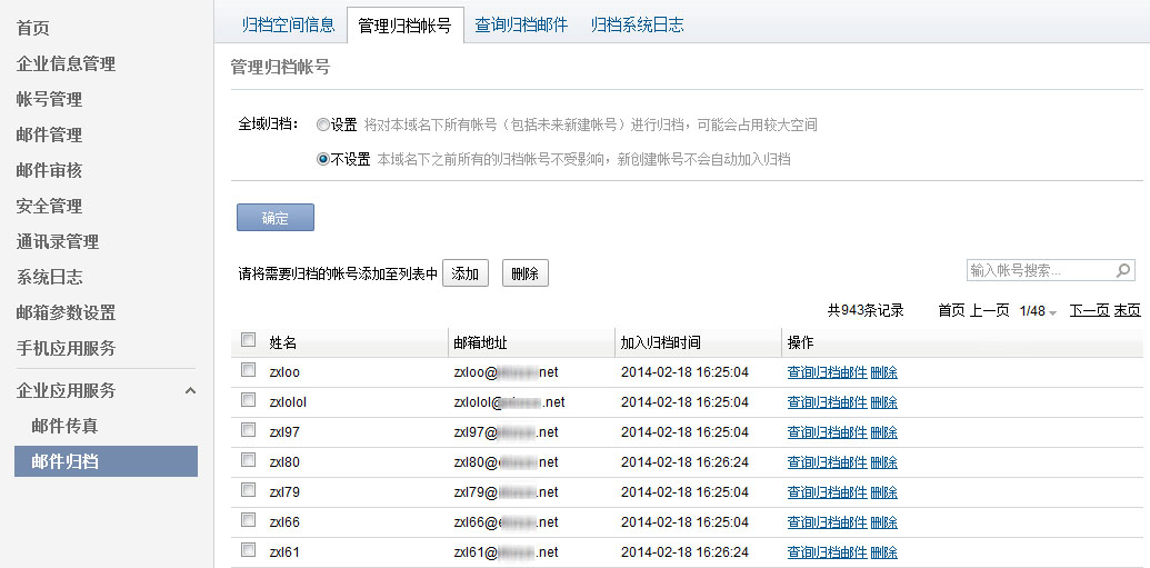 邮件归档服务正式上线,帮助企业归档重要成员的邮件,实现企业重要邮件备份和存档。此项服务收费,具体资费和开通标准欢迎咨询相应经销商。