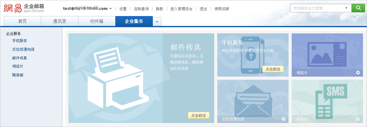 邮箱5.0极速版企业服务已上线。目前,企业服务包含的功能有:手机服务、反垃圾通知信、邮件传真、明信片和随身邮,共5项。接下来,我们将继续努力,给广大企业客户提供更全面更优质的企业服务。