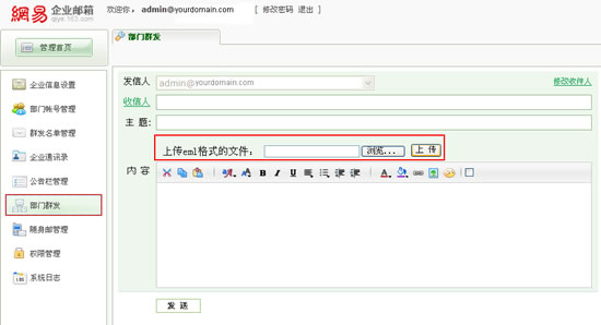 管理员在“部门群发”中,在上传eml格式文件处,选择需要上传的eml格式文件,点击“上传”。如果上传的文件较大,则需要一定的等待时间。上传完成后,可见在群发内容里,eml格式的文件正文,将直接显示在这里,而原文件内的信头,将不会出现。
