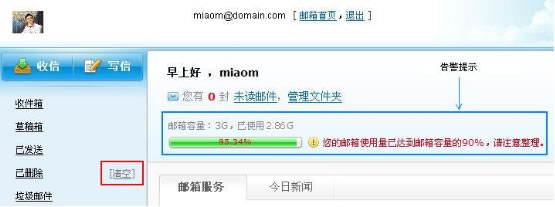 特别提示:当删除了不需要的邮件时,这些邮件将保存在“已删除”文件夹中,同样占用着邮箱容量,需要进一步“清空”它们。当清除掉不需要的邮件或文件后,邮箱使用量低于邮箱容量的90%时,该告警提示会消失,直到再次达到90%才会出现。